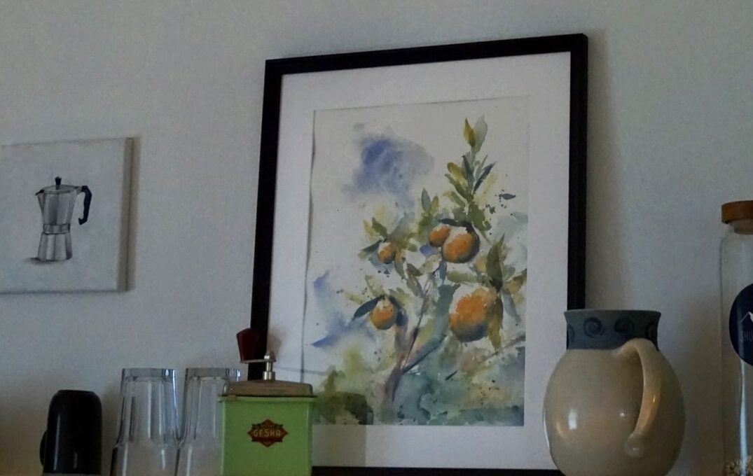 Just biked by an endlessly field of oranges. The smell, the colors, the athmosphere – I had to paint it. It fits perfectly in a kitchen.